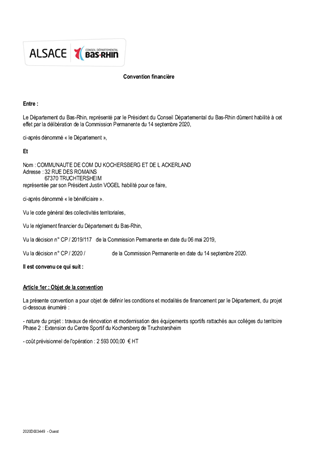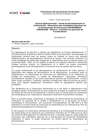 Le Département du Bas-Rhin a décidé, par délibération du Conseil Départemental n° CD/2016/158 du 8 décembre 2016 et CD/2017/004 du 20 mars 2017, de développer un partenariat renforcé avec les acteurs locaux en mettant en œuvre des contrats départementaux de développement territorial et humain. Ces contrats constituent le volet stratégique du partenariat engagé par le Département avec les acteurs locaux sur la période 2018 – 2021. Ils ont vocation à traduire une ambition collective à l’échelle de chaque territoire d’action du Département et à définir les enjeux prioritaires d’aménagement et de développement co-construits avec les acteurs des territoires. Le projet d'attractivité et de développement du renforcement de l'offre sportive à destination des collèges de Truchtersheim et de Pfulgriesheim, co-construit entre le Département, la Communauté de Communes du Kochersberg et de l'Ackerland, le collège de Truchtersheim, le collège de Pfulgriesheim, l'association Achenheim Truchtersheim Handball et les autres associations sportives de Truchtersheim, s'inscrit dans l'enjeu prioritaire, "Conforter, maintenir et pérenniser l'offre de services au public" avec pour objectif opérationnel "d'améliorer l'offre en équipements sportifs des collégiens". Par délibération de la Commission Permanente du 6 mai 2019, le Département s’est engagé à soutenir financièrement les deux phases de ce projet et a approuvé les termes du projet de convention de partenariat à conclure avec la Communauté de Communes du Kochersberg et de l'Ackerland et l'association Achenheim Truchtersheim Handball. Pour la première phase, comprenant la rénovation du Centre Sportif du Kochersberg, la rénovation du gymnase de la Souffel à Pfulgriesheim et la rénovation du terrain synthétique à Truchtersheim, une subvention d'investissement de 285 879 € a été attribuée à la Communauté de Communes du Kochersberg et de l'Ackerland au titre du Fonds de Développement et d'Attractivité. Il est proposé à la Commission Permanente d'attribuer à la Communauté de Communes du Kochersberg et de l'Ackerland une contribution financière de 777 900 euros au titre du Fonds de Développement et d'Attractivité pour la seconde phase du projet global de rénovation des installations sportives de la Communauté de Communes Kochersberg Ackerland, à savoir, le projet d’extension du Centre Sportif du Kochersberg de Truchtersheim.