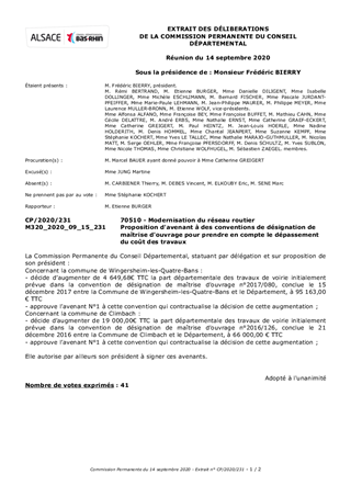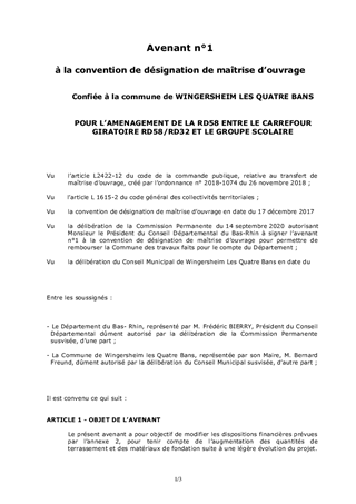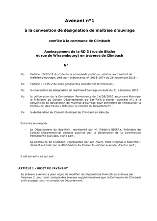 Les conventions de désignation de maîtrise d’ouvrage : - n°2017/080, adoptée par la commission permanente le 6 novembre 2017 sur la base du rapport n° CP/2017/458, visait à confier à la Commune de Wingersheim-les-Quatre-Bans les travaux d’aménagement de la RD58 (entre le carrefour giratoire RD58/RD32 et le groupe scolaire) en traverse d’agglomération de Wingersheim-les-Quatre-Bans, - n°2016/126, adoptée par la commission permanente le 3 octobre 2016 sur la base du rapport n° CP/2016/447, visait à confier à la Commune de Climbach les travaux d’aménagement de la RD3 (rue de Bitche et rue de Wissembourg) en traverse d’agglomération de Climbach. Le présent rapport a pour objet d’approuver les termes d’un projet d’avenant à ces conventions afin de prendre en compte l’augmentation de la part des travaux de la chaussée, travaux préfinancés par les Communes de Wingersheim-les-Quatre-Bans et Climbach, et qui sont à porter à la charge du Département.