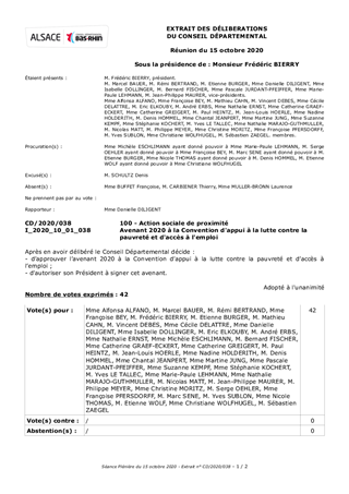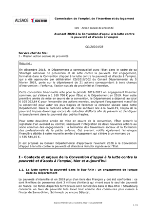 En décembre 2018, le Département a contractualisé avec l’Etat dans le cadre de sa Stratégie nationale de prévention et de lutte contre la pauvreté. Cet engagement, formalisé dans la Convention d’appui à la lutte contre la pauvreté et d’accès à l’emploi, qui a été approuvée par délibération CD/2019/002 du Conseil Départemental du 5 février 2019, porte sur le déploiement de 21 actions correspondant à trois champs d’intervention : l’enfance, l’action sociale de proximité et l’insertion. Cette convention tri-annuelle acte pour la période 2019-2021 un engagement financier commun, qui s'élève à 1 160 700 € pour l’Etat et le Département en 2019. Pour cette première année de mise en œuvre de la convention, le Département a dépensé au total 6 105 362,64 € pour l’ensemble des actions menées, soulignant l’engagement massif de la collectivité pour aider les plus fragiles et favoriser la cohésion sociale dans notre Département. Dans le contexte actuel de crise sanitaire liée à la covid-19, l’enjeu de la pauvreté impose davantage encore de redoubler d’efforts afin de prévenir et d’endiguer le basculement dans la pauvreté des publics fragiles. Pour cette deuxième année de mise en œuvre de la convention, l’État prescrit la signature d’un avenant au contrat, impliquant l’intégration de deux nouvelles actions au socle commun des engagements : la formation des travailleurs sociaux et la formation des professionnels de la petite enfance. Cet avenant notifie également l’enveloppe financière dédiée à cette nouvelle année d’engagement qui s’élève à un montant de 1 535 544,10 €. Il est proposé au Conseil Départemental d’approuver l’avenant 2020 à la Convention d’appui à la lutte contre la pauvreté et d’accès à l’emploi signée avec l’État.