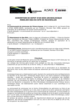 Le présent rapport propose au Conseil Départemental de déposer un bien archéologique mobilier issu du site des thermes romains à Mackwiller, propriété du Département, au Centre d'Interprétation du Patrimoine (CIP) " La Villa " à Dehlingen, et de conclure une convention de dépôt tripartite avec la Communauté de communes de l’Alsace bossue et Archéologie Alsace.