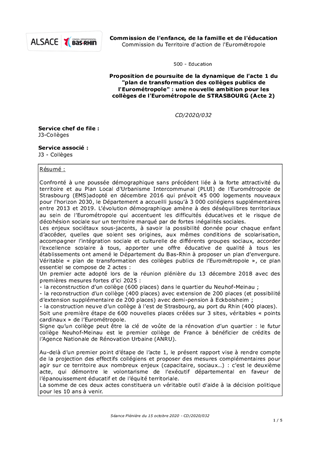 Confronté à une poussée démographique sans précédent liée à la forte attractivité du territoire et au Plan Local d'Urbanisme Intercommunal (PLUI) de l’Eurométropole de Strasbourg (EMS)adopté en décembre 2016 qui prévoit 45 000 logements nouveaux pour l'horizon 2030, le Département a accueilli jusqu’à 3 000 collégiens supplémentaires entre 2013 et 2019. L’évolution démographique amène à des déséquilibres territoriaux au sein de l’Eurométropole qui accentuent les difficultés éducatives et le risque de décohésion sociale sur un territoire marqué par de fortes inégalités sociales. Les enjeux sociétaux sous-jacents, à savoir la possibilité donnée pour chaque enfant d’accéder, quelles que soient ses origines, aux mêmes conditions de scolarisation, accompagner l’intégration sociale et culturelle de différents groupes sociaux, accorder l’excellence scolaire à tous, apporter une offre éducative de qualité à tous les établissements ont amené le Département du Bas-Rhin à proposer un plan d’envergure. Véritable « plan de transformation des collèges publics de l’Eurométropole », ce plan essentiel se compose de 2 actes : Un premier acte adopté lors de la réunion plénière du 13 décembre 2018 avec des premières mesures fortes d’ici 2025 : - la reconstruction d’un collège (600 places) dans le quartier du Neuhof-Meinau ; - la reconstruction d’un collège (400 places) avec extension de 200 places (et possibilité d’extension supplémentaire de 200 places) avec demi-pension à Eckbolsheim ; - la construction neuve d’un collège à l’est de Strasbourg, au port du Rhin (400 places). Soit une première étape de 600 nouvelles places créées sur 3 sites, véritables « points cardinaux » de l’Eurométropole. Signe qu’un collège peut être la clé de voûte de la rénovation d’un quartier : le futur collège Neuhof-Meinau est le premier collège de France à bénéficier de crédits de l’Agence Nationale de Rénovation Urbaine (ANRU). Au-delà d’un premier point d’étape de l’acte 1, le présent rapport vise à rendre compte de la projection des effectifs collégiens et proposer des mesures complémentaires pour agir sur ce territoire aux nombreux enjeux (capacitaire, sociaux…) : c’est le deuxième acte, qui démontre le volontarisme de l’exécutif départemental en faveur de l’épanouissement éducatif et de l’équité territoriale. La somme de ces deux actes constituera un véritable outil d’aide à la décision politique pour les 10 ans à venir.