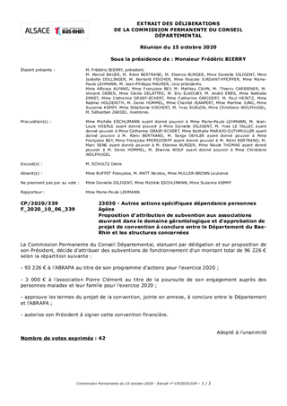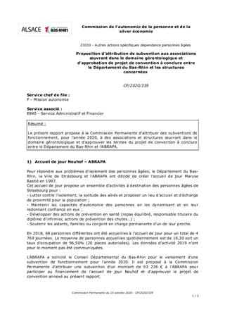 Le présent rapport propose à la Commission Permanente d'attribuer des subventions de fonctionnement, pour l'année 2020, à des associations et structures œuvrant dans le domaine gérontologique et d'approuver les termes du projet de convention à conclure entre le Département du Bas-Rhin et l'ABRAPA.