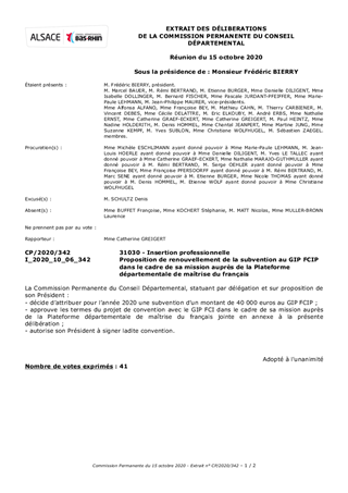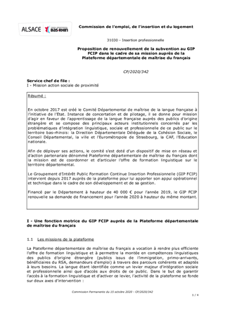 En octobre 2017 est créé le Comité Départemental de maîtrise de la langue française à l’initiative de l’Etat. Instance de concertation et de pilotage, il se donne pour mission d’agir en faveur de l’apprentissage de la langue française auprès des publics d’origine étrangère et se compose des principaux acteurs institutionnels concernés par les problématiques d’intégration linguistique, sociale et professionnelle de ce public sur le territoire bas-rhinois: la Direction Départementale Déléguée de la Cohésion Sociale, le Conseil Départemental, la ville et l'Eurométropole de Strasbourg, la CAF, l'Education nationale. Afin de déployer ses actions, le comité s’est doté d’un dispositif de mise en réseau et d’action partenariale dénommé Plateforme départementale de maîtrise du français dont la mission est de coordonner et d’articuler l’offre de formation linguistique sur le territoire départemental. Le Groupement d’Intérêt Public Formation Continue Insertion Professionnelle (GIP FCIP) intervient depuis 2017 auprès de la plateforme pour lui apporter son appui opérationnel et technique dans le cadre de son développement et de sa gestion. Financé par le Département à hauteur de 40 000 € pour l’année 2019, le GIP FCIP renouvelle sa demande de financement pour l’année 2020 à hauteur du même montant.