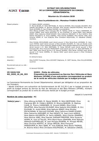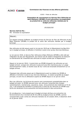 Ce rapport propose d'affecter au budget annexe du Service du Parc de Véhicules et des Bacs Rhénans (SPVBR) le produit de la vente des véhicules réalisée par le budget principal