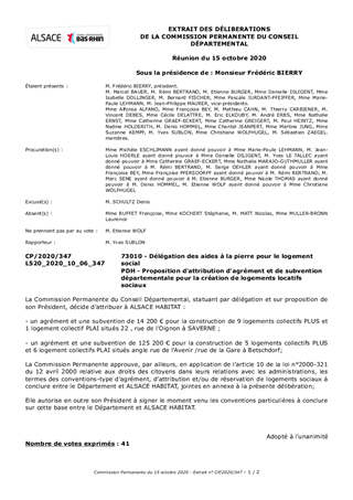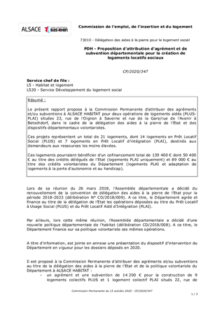 Le présent rapport propose à la Commission Permanente d’attribuer des agréments et/ou subventions à ALSACE HABITAT pour deux opérations de logements aidés (PLUS-PLAI) situées 22, rue de l’Oignon à Saverne et rue de la Gare/rue de l'Avenir à Betschdorf, dans le cadre de la délégation des aides à la pierre de l’Etat et des dispositifs départementaux volontaristes. Ces projets représentent un total de 21 logements, dont 14 logements en Prêt Locatif Social (PLUS) et 7 logements en Prêt Locatif d’intégration (PLAI), destinés aux demandeurs aux ressources les moins élevées. Ces logements pourraient bénéficier d’un cofinancement total de 139 400 € dont 50 400 € au titre des crédits délégués de l’Etat (logements PLAI uniquement) et 89 000 € au titre des crédits volontaristes du Département (logements PLAI et adaptation de logements à la perte d'autonomie et au handicap).