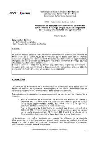 Le présent rapport propose à la Commission Permanente de désigner la Commune de Mackenheim et la Communauté de Communes de la Basse Zorn comme maîtres d’ouvrages uniques pour l’aménagement de routes départementales en agglomération, chargées à ce titre d’exercer les attributions relevant de la maîtrise d’ouvrage pour les chaussées départementales concernées. Il vise à autoriser le Président du Conseil Départemental à signer les conventions à intervenir entre ces collectivités et le Département. Ces conventions ont pour objet la désignation du maître d’ouvrage unique pour chaque opération
