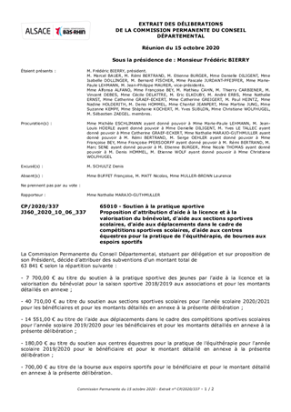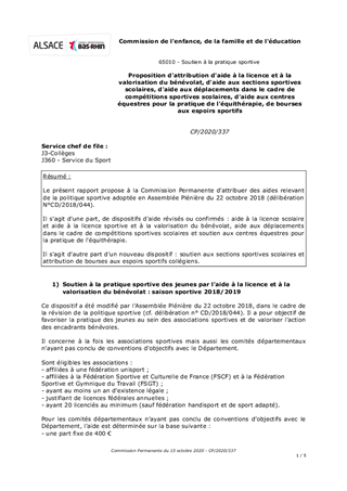 Le présent rapport propose à la Commission Permanente d'attribuer des aides relevant de la politique sportive adoptée en Assemblée Plénière du 22 octobre 2018 (délibération N°CD/2018/044). Il s'agit d'une part, de dispositifs d'aide révisés ou confirmés : aide à la licence scolaire et aide à la licence sportive et à la valorisation du bénévolat, aide aux déplacements dans le cadre de compétitions sportives scolaires et soutien aux centres équestres pour la pratique de l'équithérapie. Il s'agit d'autre part d'un nouveau dispositif : soutien aux sections sportives scolaires et attribution de bourses aux espoirs sportifs collégiens.