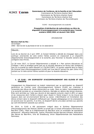 Lors de sa réunion du 2 juin 1997, le Conseil Général a décidé de s’engager dans une politique volontariste de lutte contre l’échec scolaire en s’associant à un dispositif départemental d’accompagnement à la scolarité, pour favoriser la réussite scolaire des collégiens bas-rhinois. Le 20 mars 2017, le Conseil Départemental a adopté le « Plan actions éducatives et Collèges » dont la stratégie porte tant sur la réussite éducative en faveur des collégiens que sur la qualité du cadre éducatif (n° CD/2017/007). Le soutien apporté dans le cadre du Contrat Local d'Accompagnement (CLAS) est l’une des 67 actions du plan (fiche n°6) portant sur la lutte contre l’échec scolaire et pour la réussite éducative.