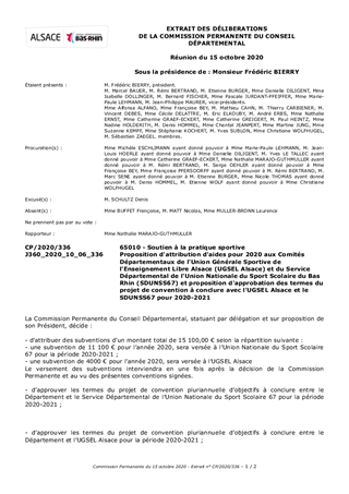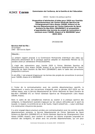 Proposition d'attribution d'aides pour 2020 aux Comités Départementaux de l'Union Générale Sportive de l'Enseignement Libre Alsace (UGSEL Alsace) et du Service Départemental de l'Union Nationale du Sport Scolaire du Bas Rhin (SDUNSS67) et proposition d'approbation des termes du projet de convention à conclure avec l'UGSEL Alsace et le SDUNSS67 pour 2020-2021