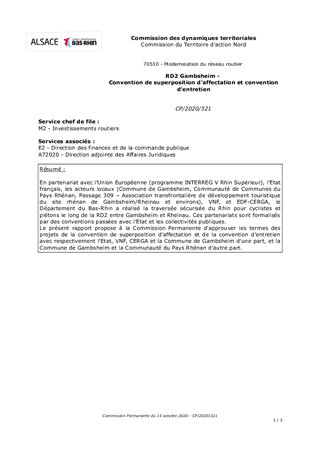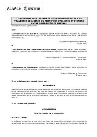En partenariat avec l’Union Européenne (programme INTERREG V Rhin Supérieur), l’Etat français, les acteurs locaux (Commune de Gambsheim, Communauté de Communes du Pays Rhénan, Passage 309 – Association transfrontalière de développement touristique du site rhénan de Gambsheim/Rheinau et environs), VNF, et EDF-CERGA, le Département du Bas-Rhin a réalisé la traversée sécurisée du Rhin pour cyclistes et piétons le long de la RD2 entre Gambsheim et Rheinau. Ces partenariats sont formalisés par des conventions passées avec l’Etat et les collectivités publiques. Le présent rapport propose à la Commission Permanente d'approuver les termes des projets de la convention de superposition d’affectation et de la convention d’entretien avec respectivement l’Etat, VNF, CERGA et la Commune de Gambsheim d’une part, et la Commune de Gambsheim et la Communauté du Pays Rhénan d’autre part.
