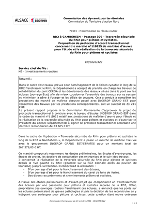 RD2 à GAMBSHEIM - Passage 309 - Traversée sécurisée du Rhin pour piétons et cyclistes. Proposition de protocole d'accord transactionnel concernant le marché n°11I025 de maîtrise d'œuvre pour l'étude et la réalisation de la traversée sécurisée du Rhin pour piétons et cyclistes