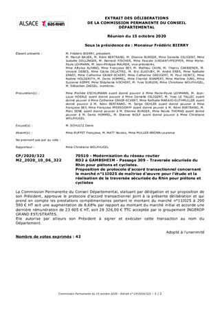 Dans le cadre des travaux prévus pour l'aménagement de la liaison cyclable le long de la RD2 franchissant le Rhin, le Département a accepté de prendre en charge les travaux de réhabilitation du pont CERGA et les dévoiements des réseaux situés dans le pont sur les écluses (ouvrage Etat) afin de mieux coordonner l'ensemble des travaux sur ce secteur et minimiser la gêne à l'usager et les délais de coupure. Cela a conduit à compléter les prestations du marché de maîtrise d'œuvre passé avec INGEROP GRAND EST pour l'ensemble des travaux par les prestations correspondantes, soit un surcoût de 23 211 €HT. Le présent rapport propose à la Commission Permanente d'approuver le projet de protocole transactionnel à conclure avec le bureau d'études INGEROP GRAND EST dans le cadre du marché n°11I025 relatif aux prestations de maîtrise d'œuvre pour l'étude et la réalisation de la traversée sécurisée du Rhin pour piétons et cyclistes et d'autoriser le Président du Conseil Départemental à signer ce protocole transactionnel accordant une dernière rémunération de 23 605 € HT.