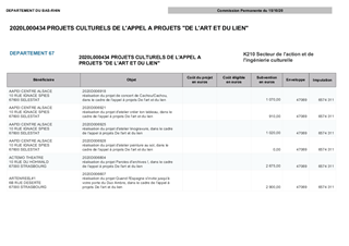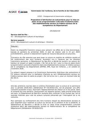 Outre les dispositifs financiers conçus pour prévenir les effets de la crise économique, sociale et sanitaire du printemps 2020, le plan de relance voté le 22 juin 2020 (CD/2020/021), prévoit le déploiement rapide de mesures éducatives et culturelles. Convaincu du rôle essentiel que peut jouer la culture en matière de cohésion sociale et de renforcement des liens humains, durement mis à l’épreuve par les récentes restrictions sanitaires, le Département du Bas-Rhin a décidé de soutenir les acteurs du secteur en lançant un appel à projets « De l’art et du lien » pour la mise en place d’une programmation culturelle d’automne dans des établissements sociaux et médico-sociaux de la compétence du Département (EHPAD, IME, foyer de l’enfance...) en octobre et novembre 2020. Le présent rapport propose à la Commission Permanente d’attribuer des subventions à 31 acteurs culturels pour la réalisation d’actions au sein d’établissements sociaux ou médico-sociaux dans le cadre du projet « De l’art et du lien », pour un montant total de 82 291 €.