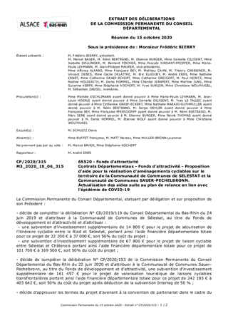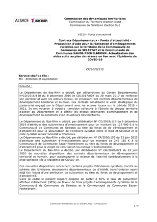 Le Département du Bas-Rhin a décidé, par délibérations du Conseil Départemental N°CD/2016/158 du 8 décembre 2016 et CD/2017/004 du 20 mars 2017 de renforcer son partenariat avec les acteurs locaux, en proposant des contrats départementaux de développement territorial et humain. Ces contrats constituent le volet stratégique du partenariat engagé par le Département avec les acteurs locaux sur la période 2018 – 2021. Ils ont vocation à traduire l’ambition collective à l’échelle de chaque territoire d’action du Département et à définir les enjeux prioritaires d’aménagement et de développement co-construits avec les acteurs des territoires. Le Département du Bas-Rhin a décidé, par délibération N° CD/2019/119 du 9 décembre 2019 d’attribuer des subventions d’investissement pour un montant de 123 900 € à la Communauté de Communes de Sélestat au titre du fonds de de développement et d’attractivité pour la sécurisation de l’itinéraire cyclable entre le Ried et Sélestat et la piste cyclable reliant Sélestat à Châtenois. Le Département du Bas-Rhin a décidé, par délibération N° CP/2020/153 du 22 juin 2020 d’attribuer une subvention d’investissement pour un montant de 245 185 € à la Communauté de Communes Sauer-Pechelbronn au titre du fonds de développement et d’attractivité pour le projet de valorisation touristique transfrontalière. Le Département du Bas-Rhin a décidé, par délibération N° CD/2020/021 du 22 juin 2020 de nouvelles dispositions des contrats départementaux de développement territorial et humain, pour accompagner la relance de l’activité consécutivement à la crise sanitaire liée à l’épidémie de COVID-19. Ces nouvelles dispositions concernent certains projets d'itinéraires cyclables inscrits au schéma des itinéraires structurants départementaux ou d'intérêt transfrontalier ayant déjà fait l'objet d'une attribution de subvention au titre du fonds de développement et d’attractivité. Dans ce cadre le présent rapport propose de porter à 50% le taux de subvention attribué initialement (30%) en faveur de trois projets d’aménagements cyclables de la Communauté de Communes de Sélestat et la Communauté de Communes Sauer-Pechelbronn.