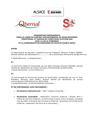 Le Département du Bas-Rhin a décidé, par délibérations du Conseil Départemental CD/2016/158 du 8 décembre 2016 et CD/2017/004 du 20 mars 2017 de renforcer son partenariat avec les acteurs locaux, en proposant des contrats départementaux de développement territorial et humain. Ces contrats constituent le volet stratégique du partenariat engagé par le Département avec les acteurs locaux sur la période 2018 – 2021. Ils ont vocation à traduire l’ambition collective à l’échelle de chaque territoire d’action du Département et à définir les enjeux prioritaires d’aménagement et de développement co-construits avec les acteurs des territoires. Dans ce cadre, le Conseil départemental a approuvé le contrat départemental de développement territorial et humain du territoire d’Action Sud le 11 décembre 2017 (délibération N° CD/2017/077). Le Conseil départemental du Bas-Rhin, la Ville d’Obernai et la Communauté de Communes du Pays de Sainte Odile entendent conjuguer leurs objectifs et leurs moyens financiers pour favoriser le développement, la compétitivité et la qualité de services du territoire de Sélestat au travers d'une « convention cadre » de partenariat. Cette convention partenariale a pour objet de mobiliser les partenaires autour de projets opérationnels, s’inscrivant dans des enjeux communs et des priorités partagées. Elle portera sur 12 projets portés par la Ville d’Obernai. Pour chacun de ces projets, les cosignataires s’engagent sur leur cofinancement, accompagné d’engagements réciproques des partenaires pour leur réalisation. Le présent rapport propose à l’Assemblée départementale d’approuver le projet de convention partenariale entre le Département, la Ville d’Obernai et la Communauté de Communes du Pays de Sainte Odile, et d’attribuer des subventions pour 12 projets représentant plus de 21 M€ HT d’investissement, pour un montant total d’aide du département de 3.519.186 €.