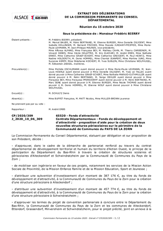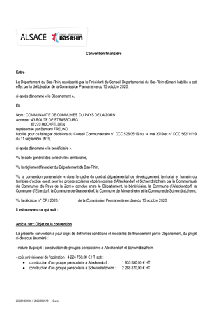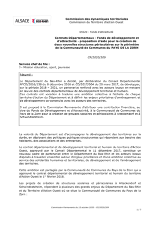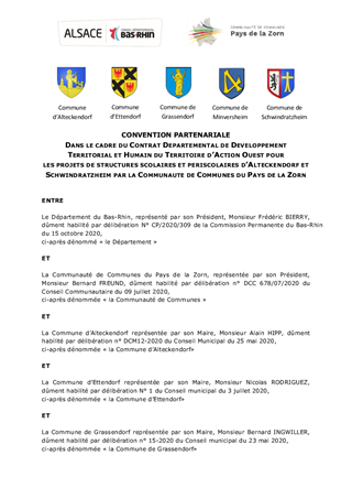 Le Département du Bas-Rhin a décidé, par délibération du Conseil Départemental N°CD/2016/158 du 8 décembre 2016 et CD/2017/004 du 20 mars 2017, de développer, sur la période 2018 – 2021, un partenariat renforcé avec les acteurs locaux en mettant en œuvre des contrats départementaux de développement territorial et humain. Ces contrats ont vocation à traduire une ambition collective à l’échelle de chaque territoire d’action du Département et à définir les enjeux prioritaires d’aménagement et de développement co-construits avec les acteurs des territoires. Il est proposé à la Commission Permanente d'attribuer une contribution financière, au titre du Fonds de Développement et d'Attractivité, à la Communauté de Communes du Pays de la Zorn pour la création de groupes scolaires et périscolaires à Alteckendorf et à Schwindratzheim.