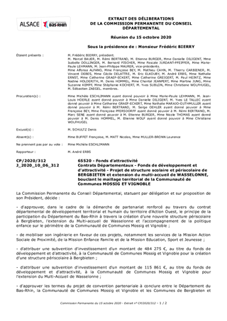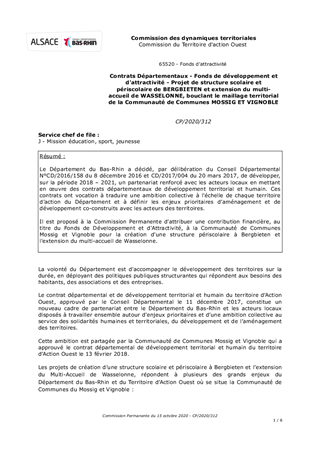 Le Département du Bas-Rhin a décidé, par délibération du Conseil Départemental N°CD/2016/158 du 8 décembre 2016 et CD/2017/004 du 20 mars 2017, de développer, sur la période 2018 – 2021, un partenariat renforcé avec les acteurs locaux en mettant en œuvre des contrats départementaux de développement territorial et humain. Ces contrats ont vocation à traduire une ambition collective à l’échelle de chaque territoire d’action du Département et à définir les enjeux prioritaires d’aménagement et de développement co-construits avec les acteurs des territoires. Il est proposé à la Commission Permanente d'attribuer une contribution financière, au titre du Fonds de Développement et d'Attractivité, à la Communauté de Communes Mossig et Vignoble pour la création d'une structure périscolaire à Bergbieten et l'extension du multi-accueil de Wasselonne.