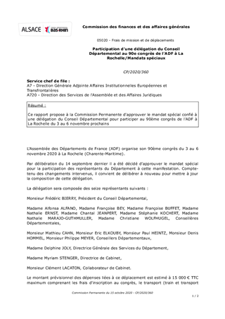 Ce rapport propose à la Commission Permanente d'approuver le mandat spécial confié à une délégation du Conseil Départemental pour participer au 90ème congrès de l'ADF à La Rochelle du 3 au 6 novembre prochains