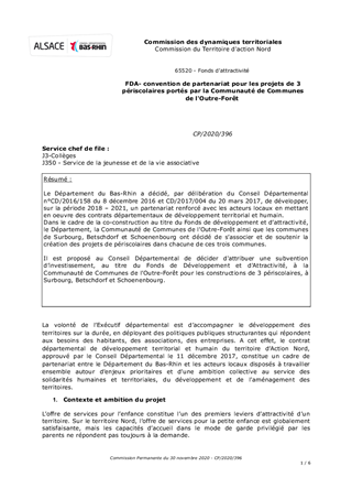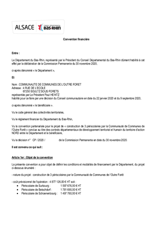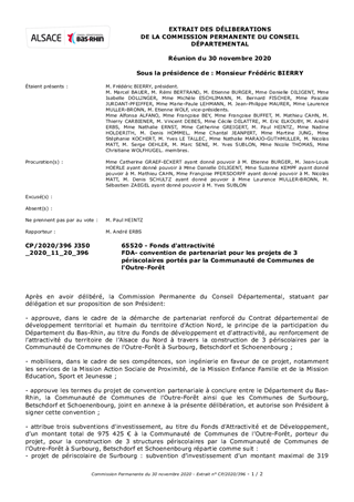 Le Département du Bas-Rhin a décidé, par délibération du Conseil Départemental n°CD/2016/158 du 8 décembre 2016 et CD/2017/004 du 20 mars 2017, de développer, sur la période 2018 – 2021, un partenariat renforcé avec les acteurs locaux en mettant en oeuvre des contrats départementaux de développement territorial et humain. Dans le cadre de la co-construction au titre du Fonds de développement et d’attractivité, le Département, la Communauté de Communes de l’Outre-Forêt ainsi que les communes de Surbourg, Betschdorf et Schoenenbourg ont décidé de s’associer et de soutenir la création des projets de périscolaires dans chacune de ces trois communes. Il est proposé au Conseil Départemental de décider d'attribuer une subvention d’investissement, au titre du Fonds de Développement et d'Attractivité, à la Communauté de Communes de l’Outre-Forêt pour les constructions de 3 périscolaires, à Surbourg, Betschdorf et Schoenenbourg.