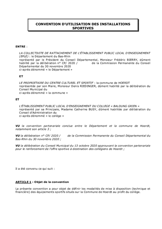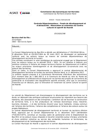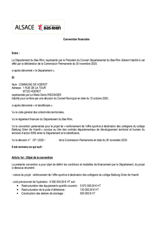 Le Conseil Départemental du Bas-Rhin a décidé, par délibérations n° CD/2016/158 du 8 décembre 2016 et CD/2017/004 du 20 mars 2017, de développer un partenariat renforcé avec les acteurs locaux au travers de contrats départementaux de développement territorial et humain. Ces contrats constituent le volet stratégique du partenariat engagé par le Département avec les acteurs locaux sur la période 2018 – 2021. Ils ont vocation à traduire une ambition collective à l’échelle de chaque territoire d’action du Département et à définir les enjeux prioritaires d’aménagement et de développement co-construits avec les acteurs des territoires. Dans ce cadre, le Conseil Départemental a approuvé le contrat départemental de développement territorial et humain du territoire d’Action Nord, le 11 décembre 2017. Le présent rapport propose à la Commission Permanente d’attribuer des subventions d’un montant total de 1 686 000 € à la Commune de Hoerdt au titre du Fonds de Développement et d'Attractivité et d’approuver les termes des projets de conventions de partenariat et d'utilisation des équipements sportifs annexés, ainsi que la convention financière qui en découle, pour la rénovation et l'extension du centre culturel et sportif de Hoerdt.