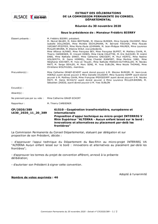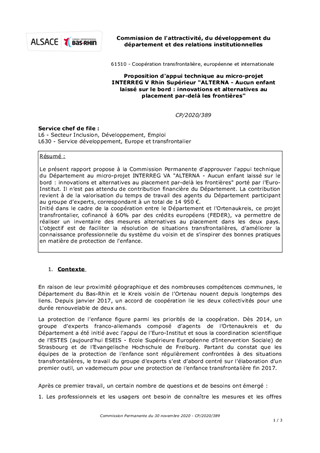 Le présent rapport propose à la Commission Permanente d'approuver l'appui technique du Département au micro-projet INTERREG VA "ALTERNA - Aucun enfant laissé sur le bord : innovations et alternatives au placement par-delà les frontières" porté par l'Euro-Institut. Il n’est pas attendu de contribution financière du Département. La contribution revient à de la valorisation du temps de travail des agents du Département participant au groupe d’experts, correspondant à un total de 14 950 €. Initié dans le cadre de la coopération entre le Département et l'Ortenaukreis, ce projet transfrontalier, cofinancé à 60% par des crédits européens (FEDER), va permettre de réaliser un inventaire des mesures alternatives au placement dans les deux pays. L'objectif est de faciliter la résolution de situations transfrontalières, d'améliorer la connaissance professionnelle du système du voisin et de s’inspirer des bonnes pratiques en matière de protection de l'enfance.