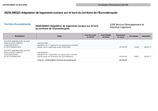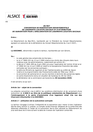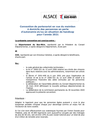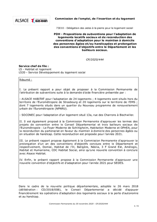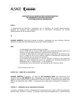 I. Le présent rapport a pour objet de proposer à la Commission Permanente de l’attribution de subventions suite à la demande d’aide financière présentée par : - ALSACE HABITAT pour l’adaptation de 24 logements ; 4 logements sont situés hors du territoire de l’Eurométropole de Strasbourg et 20 logements sur le territoire de l’EMS ; dont 7 logements situés dans un quartier du Nouveau programme de renouvellement urbain de l’Eurométropole (NPNRU). - SOCONEC pour l’adaptation d’un logement situé 13a, rue des Charrons à Bischwiller. II. Il est également proposé à la Commission Permanente d'approuver les termes des projets de convention entre le Conseil Départemental et trois bailleurs sociaux de l’Eurométropole : Le Foyer Moderne de Schiltigheim, Habitation Moderne et OPHEA, pour la reconduction du partenariat en faveur du maintien à domicile des personnes âgées ou en situation de handicap. Cette reconduction est proposée pour l'année 2021. III. Le présent rapport propose également à la Commission Permanente d’approuver la prolongation d’un an des conventions d’objectifs conclues entre le Département et respectivement, Domial, Habitat de l’Ill, Batigère, Néolia, 3 F Grand Est, Amélogis, Habitat et Humanisme, CDC Habitat Social, ainsi qu’une nouvelle convention à conclure avec Alsace Habitat. IV. Enfin, le présent rapport propose à la Commission Permanente d'approuver une nouvelle convention d'objectifs et d'adaptation pour l'année 2021 pour SEDES.