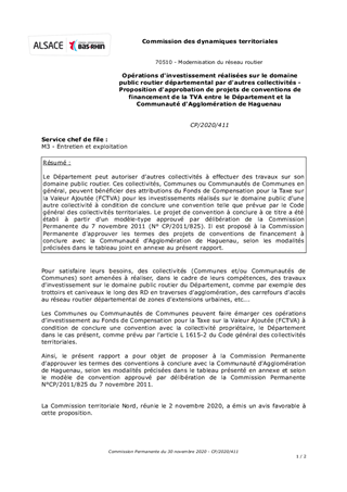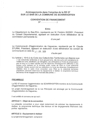 Le Département peut autoriser d’autres collectivités à effectuer des travaux sur son domaine public routier. Ces collectivités, Communes ou Communautés de Communes en général, peuvent bénéficier des attributions du Fonds de Compensation pour la Taxe sur la Valeur Ajoutée (FCTVA) pour les investissements réalisés sur le domaine public d’une autre collectivité à condition de conclure une convention telle que prévue par le Code général des collectivités territoriales. Le projet de convention à conclure à ce titre a été établi à partir d’un modèle-type approuvé par délibération de la Commission Permanente du 7 novembre 2011 (N° CP/2011/825). Il est proposé à la Commission Permanente d'approuver les termes des projets de conventions de financement à conclure avec la Communauté d'Agglomération de Haguenau, selon les modalités précisées dans le tableau joint en annexe au présent rapport.