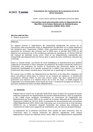 Le rapport soumet à l’approbation de l’assemblée délibérante les termes de la convention socle pluriannuelle entre le Département du Bas-Rhin et la Caisse Nationale de Solidarité pour l’Autonomie (CNSA). Cette convention-socle permet d’organiser la poursuite de versement des concours par la CNSA pour la période 2021-2024 et de décliner les conclusions de la 5e conférence nationale du handicap du 11 février 2020 et de l’accord de méthode conclu entre l’Etat et les Départements représentés par l’Assemblée des Départements de France dans le cadre de cette conférence nationale du handicap. Dans un second temps, une feuille de route stratégique et opérationnelle plus globale négociée en formalisé en 2021 précisant les ambitions de chaque collectivité relatives à l’ensemble des politiques de soutien à l’autonomie des personnes âgées et des personnes handicapées et le soutien éventuel de la CNSA à ces actions, à la lumière notamment des travaux conduits dans l’intervalle sur le grand âge et l’autonomie. En accord avec la CNSA, les Départements du Bas-Rhin et du Haut-Rhin disposent de deux conventions socles dans la mesure où au moment de signature, la Collectivité européenne d’Alsace (CEA) ne sera pas encore créée. Ces deux conventions-socle prévoient une mention à la création future de la CeA. En 2021, la CNSA propose la négociation et la formalisation d’une feuille de route « Collectivité européenne d’Alsace » qui sera l’occasion de réunir les deux Départements.