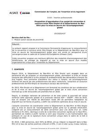 Le présent rapport propose à la Commission Permanente d’approuver le renouvellement de la convention à conclure entre Pôle Emploi et le Département du Bas-Rhin pour la mise en œuvre de l’accompagnement global pour une année en perspective d’une convergence dans le cadre de la Collectivité Européenne d’Alsace (CeA). Cette convention propose une meilleure définition des modalités d’accompagnement des bénéficiaires, de pilotage du dispositif et vise la mise en œuvre d’un modèle organisationnel unique pour l’ensemble du Département.