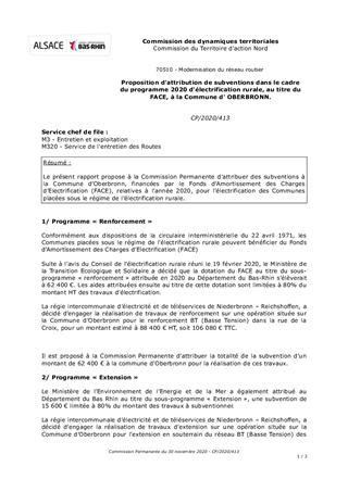 Le présent rapport propose à la Commission Permanente d’attribuer des subventions à la Commune d’Oberbronn, financées par le Fonds d’Amortissement des Charges d’Electrification (FACE), relatives à l’année 2020, pour l’électrification des Communes placées sous le régime de l’électrification rurale.