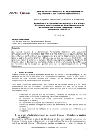 Le rapport propose à la Commission Permanente d’attribuer une subvention d’investissement d’un montant de 300 000 € à la Ville de Strasbourg pour l’extension du Lieu d’Europe, conformément aux engagements pris par le Département du Bas-Rhin dans le cadre du contrat triennal « Strasbourg, capitale européenne 2018-2020 ». Le projet, de nature à renforcer le statut de Strasbourg, capitale européenne des Droits de l’Homme et de la Démocratie, permettra à la fois la création d’une salle de conférences, la rénovation de la maison du gardien ainsi que le réaménagement de la Villa Kayserguet.