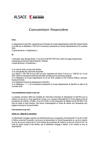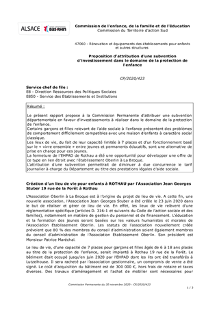 Le présent rapport propose à la Commission Permanente d'attribuer une subvention départementale en faveur d'investissements à réaliser dans le domaine de la protection de l’enfance. Certains garçons et filles relevant de l’aide sociale à l’enfance présentent des problèmes de comportement difficilement compatibles avec une maison d’enfants à caractère social classique. Les lieux de vie, du fait de leur capacité limitée à 7 places et d’un fonctionnement basé sur le « vivre ensemble » entre jeunes et permanents éducatifs, sont une alternative de prise en charge pour ces jeunes. La fermeture de l’EHPAD de Rothau a été une opportunité pour développer une offre de ce type en lien étroit avec l’établissement Oberlin à La Broque. L’attribution d’une subvention permettrait de diminuer à due concurrence le tarif journalier à charge du Département au titre des prestations légales d’aide sociale.