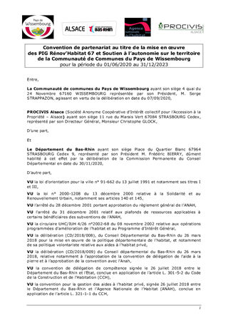 Le présent rapport propose à la Commission Permanente de décider de la mise en place de trois conventions de partenariat avec les Communautés de Communes de Sélestat, du Pays de Wissembourg, et de L'Outre Forêt dans le cadre de la mise en œuvre des Programmes d’Intérêt Général (PIG) Rénov’Habitat et Soutien à l’Autonomie.
