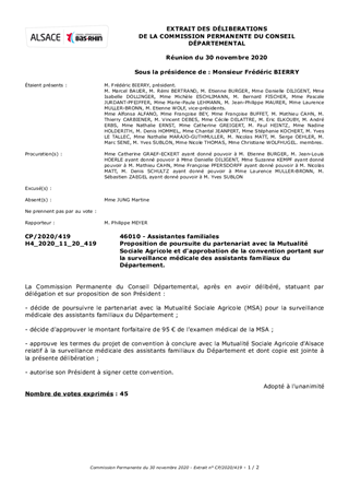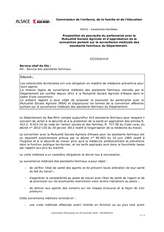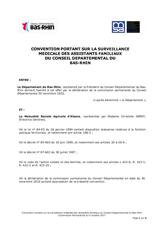 Les collectivités territoriales ont une obligation en matière de médecine préventive pour leurs agents. La mission légale de surveillance médicale des assistants familiaux recrutés par le Département est confiée depuis 2011 à la Mutualité Sociale Agricole d'Alsace dans le cadre d'une convention. Le présent rapport a pour objet de proposer la poursuite du partenariat avec la Mutualité Sociale Agricole (MSA) et d'approuver les termes de la convention afférente portant sur la surveillance médicale des assistants familiaux du Département.