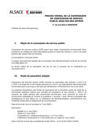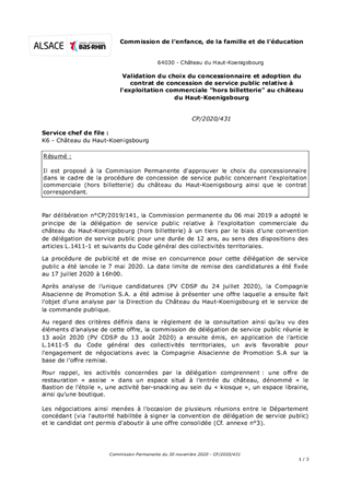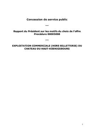 Il est proposé à la Commission Permanente d'approuver le choix du concessionnaire dans le cadre de la procédure de concession de service public concernant l’exploitation commerciale (hors billetterie) du château du Haut-Koenigsbourg ainsi que le contrat correspondant.