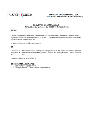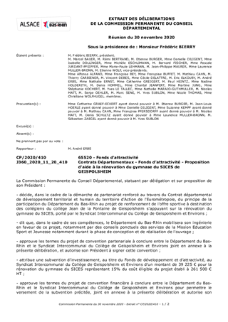 Le Département du Bas-Rhin a décidé, par délibération du Conseil Départemental n°CD/2016/158 du 8 décembre 2016 et CD/2017/004 du 20 mars 2017, de développer, sur la période 2018 – 2021, un partenariat renforcé avec les acteurs locaux en mettant en œuvre des contrats départementaux de développement territorial et humain. Ces contrats ont vocation à traduire une ambition collective à l’échelle de chaque territoire d’action et à définir les enjeux prioritaires d’aménagement et de développement co-construits avec les acteurs des territoires. Le projet vise à maintenir une offre sportive à destination des collégiens du collège Jean de la Fontaine de Geispolsheim et s'inscrit dans les enjeux prioritaires "Assurer la réussite éducative et l'épanouissement des jeunes" et "Améliorer l'offre en équipements sportifs, notamment à destination des collégiens". Il est proposé à la Commission Permanente d'attribuer, au titre du Fonds de Développement et d'Attractivité, au Syndicat Intercommunal du Collège de Geisolsheim et environs une contribution financière, sous forme de subvention d’investissement d’un montant total de 39 225 € pour la rénovation du gymnase du SICES.