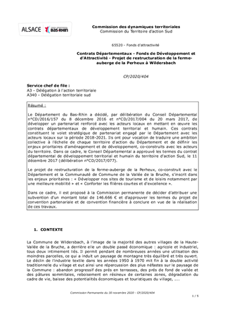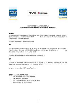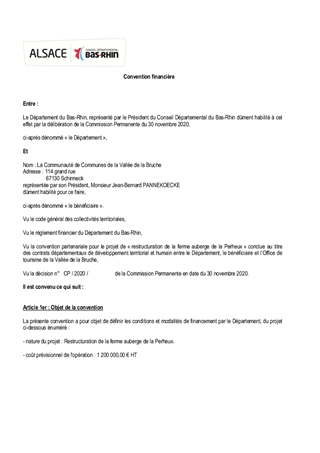 Le Département du Bas-Rhin a décidé, par délibération du Conseil Départemental n°CD/2016/157 du 8 décembre 2016 et n°CD/2017/004 du 20 mars 2017, de développer un partenariat renforcé avec les acteurs locaux en mettant en œuvre les contrats départementaux de développement territorial et humain. Ces contrats constituent le volet stratégique de partenariat engagé par le Département avec les acteurs locaux sur la période 2018-2021. Ils ont pour vocation de traduire une ambition collective à l'échelle de chaque territoire d'action du Département et de définir les enjeux prioritaires d'aménagement et de développement, co-construits avec les acteurs du territoire. Dans ce cadre, le Conseil Départemental a approuvé les termes du contrat départemental de développement territorial et humain du territoire d'action Sud, le 11 décembre 2017 (délibération n°CD/2017/077). Le projet de restructuration de la ferme-auberge de la Perheux, co-construit avec le Département et la Communauté de Commune de la Vallée de la Bruche, s'inscrit dans les enjeux prioritaires : « Développer nos sites de tourisme et de loisirs notamment par une meilleure mobilité » et « Conforter les filières courtes et d'excellence ». Dans ce cadre, il est proposé à la Commission permanente de décider d'attribuer une subvention d'un montant total de 146.666 € et d'approuver les termes du projet de convention partenariale et de convention financière à conclure en vue de la réalisation de ces travaux.