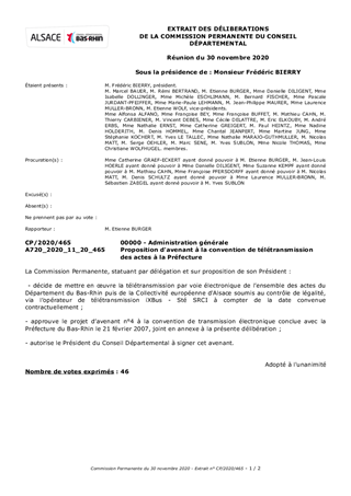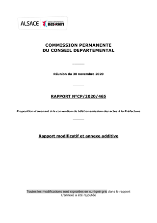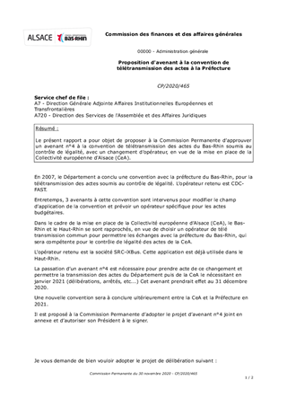 Le présent rapport a pour objet de proposer à la Commission Permanente d’approuver un avenant n°4 à la convention de télétransmission des actes du Bas-Rhin soumis au contrôle de légalité, avec un changement d’opérateur, en vue de la mise en place de la Collectivité européenne d'Alsace (CeA).