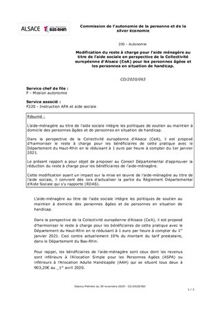 Modification du reste à charge pour l'aide ménagère au titre de l'aide sociale en perspective de la Collectivité européenne d'Alsace (CeA) pour les personnes âgées et les personnes en situation de handicap.