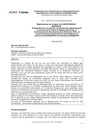 Présentant un linéaire de 4,6 km de voie ferrée non électrifiée et offrant des performances de l'ordre de 30 km/h, la ligne fret ferroviaire Roeschwoog-Beinheim figure parmi les 6 lignes capillaires fret exploitées en Alsace. Cette ligne supporte un trafic important de 425 trains/an soit 580 000 tonnes nettes en provenance ou à destination de l'entreprise Roquette (leader mondial de la production d'amidon et dérivés), soit l'une des plus importantes lignes fret du Grand Est tant en trafic qu'en tonnage concerné. Compte tenu de l’état de dégradation de la voie ferrée, SNCF Réseau a informé les collectivités locales et l'entreprise Roquette, que la ligne était menacée d'un ralentissement à 20 km/h à partir de 2023, et d’un risque d'interdiction de circulation dès 2025 sans investissement de renouvellement. Compte tenu des enjeux liés au développement de l’économie sur le territoire, à la pérennité de l’emploi, et à l’intérêt transfrontalier de cette ligne, SNCF Réseau, l'Etat, toutes les collectivités territoriales et l'entreprise Roquette se sont mobilisées pour assurer le financement des travaux nécessaires estimés à 3 758 000 € HT courants pour maintenir en service cette voie. Pour le Département du Bas-Rhin, l'enjeu spécifique d’éviter un report important de poids lourds sur son réseau routier et donc de préserver la durée de vie des chaussées et la sécurité sur les routes départementales, justifie sa participation financière aux travaux de régénération de cette ligne. La part de financement apportée par le Département, de l’ordre de 8,5 %, est primordiale ; elle permet le bouclage du plan de financement.