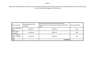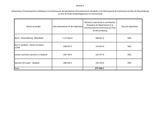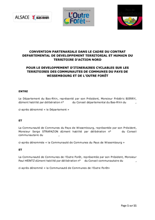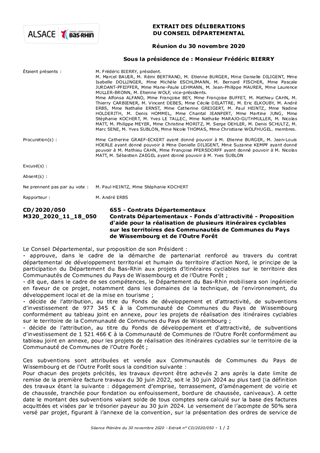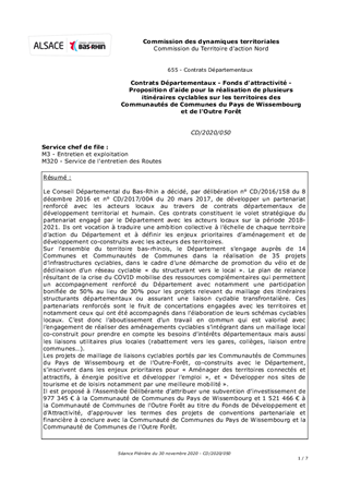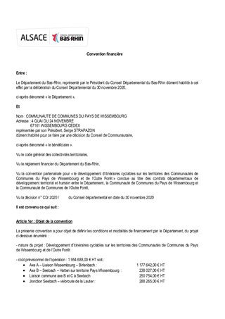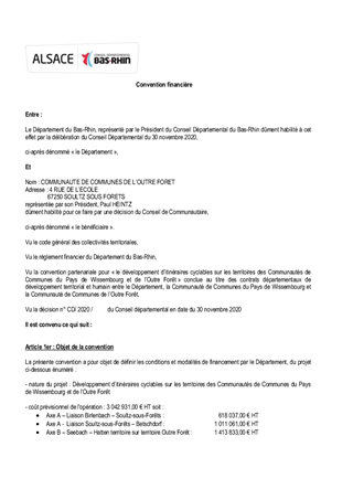 Le Conseil Départemental du Bas-Rhin a décidé, par délibération n° CD/2016/158 du 8 décembre 2016 et n° CD/2017/004 du 20 mars 2017, de développer un partenariat renforcé avec les acteurs locaux au travers de contrats départementaux de développement territorial et humain. Ces contrats constituent le volet stratégique du partenariat engagé par le Département avec les acteurs locaux sur la période 2018- 2021. Ils ont vocation à traduire une ambition collective à l’échelle de chaque territoire d’action du Département et à définir les enjeux prioritaires d’aménagement et de développement co-construits avec les acteurs des territoires. Sur l’ensemble du territoire bas-rhinois, le Département s’engage auprès de 14 Communes et Communautés de Communes dans la réalisation de 35 projets d’infrastructures cyclables, dans le cadre d’une démarche de promotion du vélo et de déclinaison d’un réseau cyclable « du structurant vers le local ». Le plan de relance résultant de la crise du COVID mobilise des ressources complémentaires qui permettent un accompagnement renforcé du Département avec notamment une participation bonifiée de 50% au lieu de 30% pour les projets relevant du maillage des itinéraires structurants départementaux ou assurant une liaison cyclable transfrontalière. Ces partenariats renforcés sont le fruit de concertations engagées avec les territoires et notamment ceux qui ont été accompagnés dans l’élaboration de leurs schémas cyclables locaux. C’est donc l’aboutissement d’un travail en commun qui est valorisé avec l’engagement de réaliser des aménagements cyclables s’intégrant dans un maillage local co-construit pour prendre en compte les besoins d’intérêts départementaux mais aussi les liaisons utilitaires plus locales (rabattement vers les gares, collèges, liaison entre communes…). Les projets de maillage de liaisons cyclables portés par les Communautés de Communes du Pays de Wissembourg et de l’Outre-Forêt, co-construits avec le Département, s’inscrivent dans les enjeux prioritaires pour « Aménager des territoires connectés et attractifs, à énergie positive et développer l'emploi », et « Développer nos sites de tourisme et de loisirs notamment par une meilleure mobilité ». Il est proposé à l’Assemblée Délibérante d’attribuer une subvention d’investissement de 977 345 € à la Communauté de Communes du Pays de Wissembourg et 1 521 466 € à la Communauté de Communes de l’Outre Forêt au titre du Fonds de Développement et d’Attractivité, d’approuver les termes des projets de conventions partenariale et financière à conclure avec la Communauté de Communes du Pays de Wissembourg et la Communauté de Communes de l’Outre Forêt.