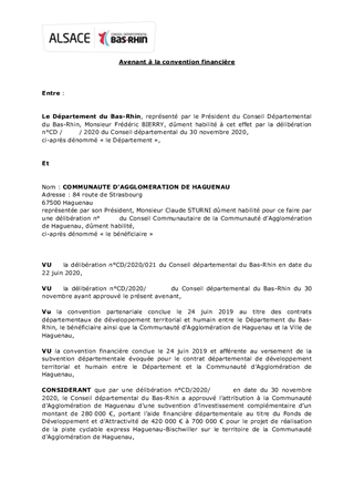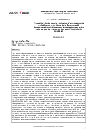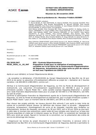 Le Conseil Départemental du Bas-Rhin a décidé, par délibération n° CD/2016/158 du 8 décembre 2016 et n° CD/2017/004 du 20 mars 2017, de développer un partenariat renforcé avec les acteurs locaux au travers de contrats départementaux de développement territorial et humain. Ces contrats constituent le volet stratégique du partenariat engagé par le Département avec les acteurs locaux sur la période 2018- 2021. Ils ont vocation à traduire une ambition collective à l’échelle de chaque territoire d’action du Département et à définir les enjeux prioritaires d’aménagement et de développement co-construits avec les acteurs des territoires. Sur l’ensemble du territoire bas-rhinois, le Département s’engage auprès de 14 Communes et Communautés de Communes dans la réalisation de 35 projets d’infrastructures cyclables, dans le cadre d’une démarche de promotion du vélo et de déclinaison d’un réseau cyclable « du structurant vers le local ». Le plan de relance résultant de la crise du COVID mobilise des ressources complémentaires qui permettent un accompagnement renforcé du Département avec notamment une participation bonifiée de 50% au lieu de 30% pour les projets dont la réalisation est possible à court terme et qui relèvent du maillage des itinéraires structurants départementaux ou assurent une liaison cyclable transfrontalière. Ces partenariats renforcés sont le fruit de concertations engagées avec les territoires et notamment ceux qui ont été accompagnés dans l’élaboration de leurs schémas cyclables locaux. C’est donc l’aboutissement d’un travail en commun qui est valorisé avec l’engagement de réaliser des aménagements cyclables s’intégrant dans un maillage local co-construit pour prendre en compte les besoins d’intérêts départementaux mais aussi les liaisons utilitaires plus locales (rabattement vers les gares, collèges, liaison entre communes…). Le Département du Bas-Rhin a décidé, par délibération du Conseil Départemental n° CD/2020/021 du 22 juin 2020 de nouvelles dispositions des contrats départementaux de développement territorial et humain, pour accompagner la relance de l’activité consécutivement à la crise sanitaire liée à l’épidémie de COVID-19. Ces nouvelles dispositions concernent les projets d'itinéraires cyclables inscrits au schéma des itinéraires structurants départementaux ou d'intérêt transfrontalier ayant déjà fait l'objet d'une attribution de subvention au titre du fonds de développement et d’attractivité. Le projet de piste cyclable express Haguenau-Bischwiller répond aux critères d’éligibilité de bonification de subvention. Le taux initial de la participation départementale fixée à 30% peut donc être porté à 50%, au titre de l’intégration des projets dans le réseau des itinéraires structurants départementaux.