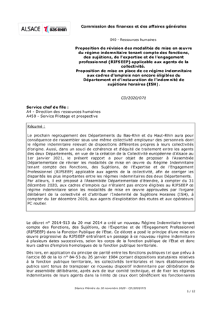 Le prochain regroupement des Départements du Bas-Rhin et du Haut-Rhin aura pour conséquence de rassembler sous une même collectivité employeur des personnels dont le régime indemnitaire relevait de dispositions différentes propres à leurs collectivités d’origine. Aussi, dans un souci de cohérence et d’équité de traitement entre les agents des deux Départements, en vue de la création de la Collectivité européenne d’Alsace au 1er janvier 2021, le présent rapport a pour objet de proposer à l’Assemblée Départementale de réviser les modalités de mise en œuvre du Régime Indemnitaire tenant compte des Fonctions, des Sujétions, de l’Expertise et de l’Engagement Professionnel (RIFSEEP) applicable aux agents de la collectivité, afin de corriger les disparités les plus importantes entre les régimes indemnitaires des deux Départements. Par ailleurs, il est proposé à l’Assemblée Départementale d’étendre, à compter du 31 décembre 2020, aux cadres d’emplois qui n’étaient pas encore éligibles au RIFSEEP ce régime indemnitaire selon les modalités de mise en œuvre approuvées par l’organe délibérant de la collectivité et d’attribuer l’Indemnité de Sujétions Horaires (ISH), à compter du 1er décembre 2020, aux agents d’exploitation des routes et aux opérateurs PC routier.