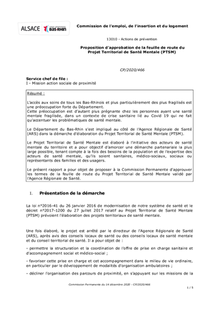 L’accès aux soins de tous les Bas-Rhinois et plus particulièrement des plus fragilisés est une préoccupation forte du Département. Cette préoccupation est d’autant plus prégnante chez les personnes ayant une santé mentale fragilisée, dans un contexte de crise sanitaire lié au Covid 19 qui ne fait qu’accentuer les problématiques de santé mentale. Le Département du Bas-Rhin s’est impliqué au côté de l’Agence Régionale de Santé (ARS) dans la démarche d’élaboration du Projet Territorial de Santé Mentale (PTSM). Le Projet Territorial de Santé Mentale est élaboré à l’initiative des acteurs de santé mentale du territoire et a pour objectif d’amorcer une démarche partenariale la plus large possible, tenant compte à la fois des besoins de la population et de l’expertise des acteurs de santé mentale, qu’ils soient sanitaires, médico-sociaux, sociaux ou représentants des familles et des usagers. Le présent rapport a pour objet de proposer à la Commission Permanente d'approuver les termes de la feuille de route du Projet Territorial de Santé Mentale validé par l’Agence Régionale de Santé.