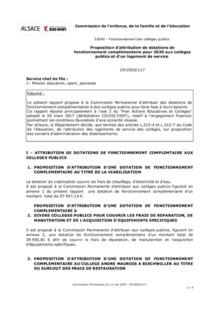 Le présent rapport propose à la Commission Permanente d'attribuer des dotations de fonctionnement complémentaires à des collèges publics pour faire face à leurs besoins. Ce rapport répond principalement à l'axe 2 du "Plan Actions Educatives et Collèges" adopté le 20 mars 2017 (délibération CD/2017/007), relatif à l'engagement financier permettant les conditions favorables d'une scolarité réussie. Par ailleurs, le Département décide, aux termes des articles L.213-4 et L.213-7 du Code de l'éducation, de l'attribution des logements de service des collèges, sur proposition des conseils d'administration des établissements.