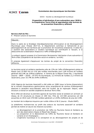 Dans le cadre de la Stratégie Interdépartementale d'Innovation et de Développement Touristique pour l'Alsace 2017-21, le Département contribue à l'attractivité et au développement de son territoire par la promotion de l'excellence alsacienne. A cette fin, il soutient des associations à vocation touristique qui contribuent à l'accueil, à la découverte de la destination Alsace et à l'offre d'hébergement. Le présent rapport propose à la Commission Permanente l'attribution d'une subvention à Terre d'Est (Coopérative de tourisme social et solidaire / ex-AJA). Il propose également d'approuver les termes du projet de la convention financière afférente.