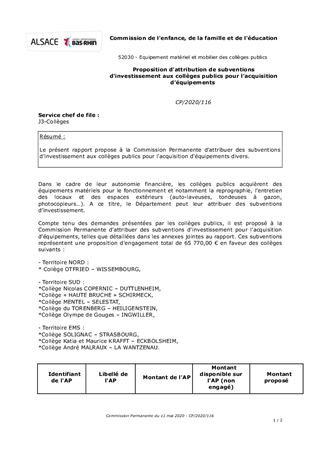 Le présent rapport propose à la Commission Permanente d'attribuer des subventions d'investissement aux collèges publics pour l'acquisition d'équipements divers.