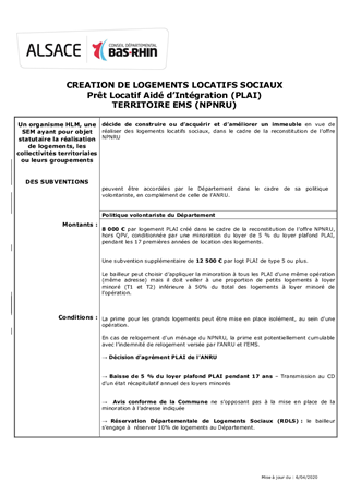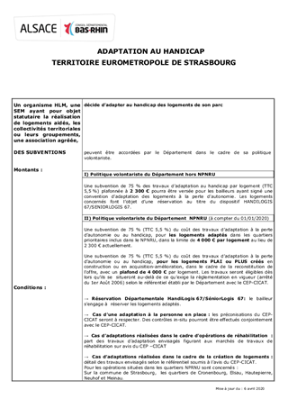 Par sa délibération n°CD/2019/131 en date du 9 décembre 2019, le Conseil Départemental a décidé de renforcer son dispositif volontariste d'aides à l'habitat, afin de soutenir le pouvoir d'achat des Bas-Rhinois, et a donné délégation à la Commission Permanente pour préciser, au besoin, les modalités pratiques d'application de ces nouvelles aides. Il est donc proposé à la Commission Permanente de décider de modalités d'application complémentaires à celles fixées par la délibération du 9 décembre 2019 pour les trois dispositifs créés ou complétés. Ces modalités sont reprises dans les trois fiches descriptives annexées au présent rapport. Alors même que le logement est le premier poste de dépenses des ménages bas-rhinois les plus fragiles, ce nouveau dispositif d’aides s’inscrit dans l’engagement fort du Département dans la lutte contre la pauvreté et en faveur de l’autonomie des personnes âgées et handicapées. En s’appuyant notamment sur des réductions de loyers accordées en contrepartie des subventions départementales, il vient soutenir la production de logements sociaux accessibles et abordables financièrement.