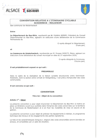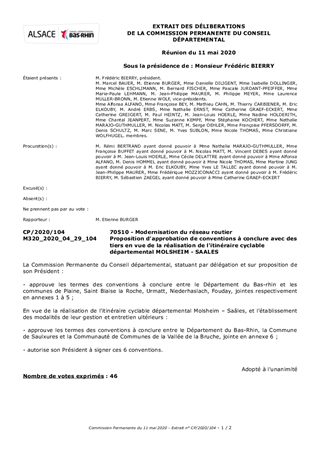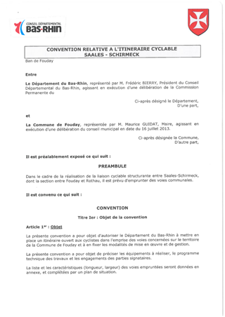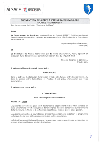En partenariat avec les acteurs locaux, le Département du Bas-Rhin réalise des itinéraires cyclables selon les dispositions du Plan Vélo 2020. Ces partenariats sont formalisés par des conventions passées avec les collectivités publiques. Le présent rapport propose à la Commission Permanente d'approuver les termes des projets de conventions de l'itinéraire cyclable Molsheim - Saâles à passer avec les Communes de Plaine, Saint Blaise La Roche, Niederhaslach, Urmatt, Fouday, Saulxures et la Communauté de Communes de la Vallée de la Bruche.