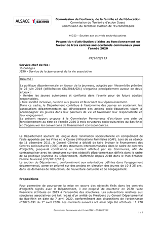 La politique départementale en faveur de la jeunesse, adoptée par l’Assemblée plénière le 25 juin 2018 (délibération CD/2018/021) s’organise principalement autour de deux enjeux : - Rendre les jeunes autonomes et confiants dans l’avenir pour de futurs adultes responsables, - Une société inclusive, ouverte aux jeunes et favorisant leur épanouissement. Dans ce cadre, le Département contribue à l’autonomie des jeunes en soutenant les associations départementales qui développent des actions socio-éducatives visant à accompagner les jeunes dans leur parcours de vie et favorisant leur responsabilité et leur engagement. Le présent rapport propose à la Commission Permanente d'attribuer une aide de fonctionnement au titre de l'année 2020 à trois structures socio-culturelles du Bas-Rhin et d'approuver les conventions de financement correspondantes.